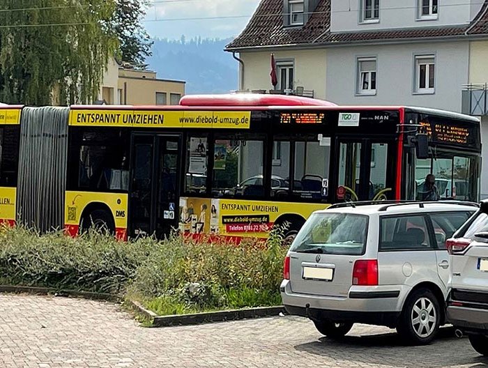 DMS Diebold geht noch einen Schritt weiter und lässt künftig auch andere große Fahrzeuge mit DMS-Logo fahren. Seit September ist ein kompletter Bus aus dem Nahverkehr mit der gelben Gestaltung des Offenburger Umzugsunternehmens beklebt. Die Passanten erfahren, dass man mit Diebold »entspannt umziehen« kann. Jobsuchende lädt der Logistiker zur Bewerbung als Fachkraft oder Azubi ein. So geht auffällige Werbung!